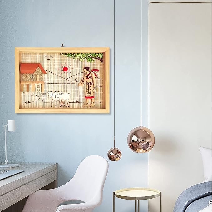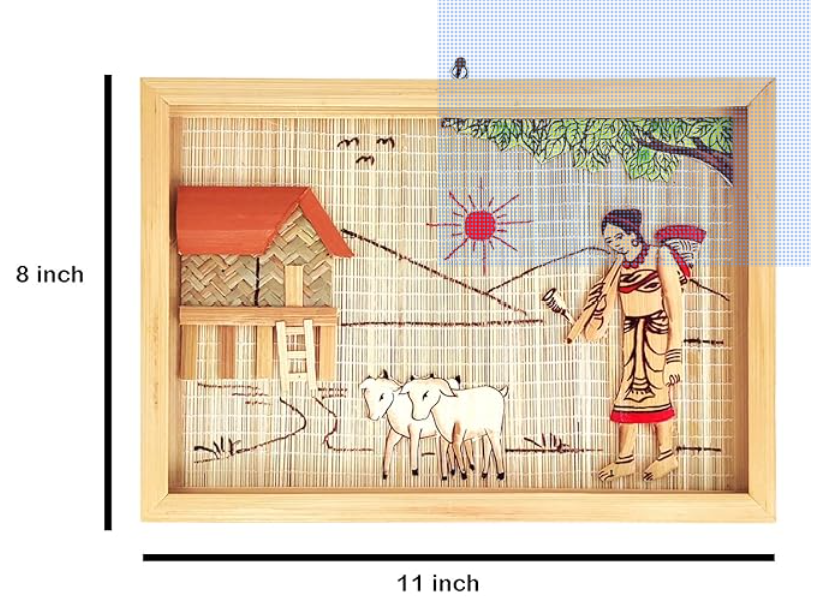 Healthy harvest Painting Of Hut With Tribal Lady Village Life Bamboo Design Handicrafted Interior Wall Hangings for Living room and guest room home decor Items and Wall Decor (Frame) 8 * 11 inch